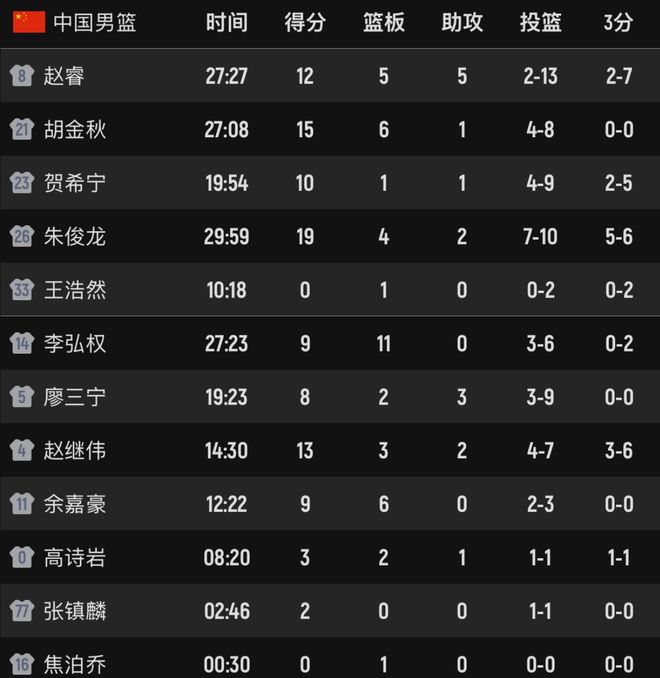 根据球员的表现来看,中国队有3名球员发挥很出色。首先是朱俊龙,三分球6中5,砍下19分4板2助,是中国队逆转的关键先生。其次是李弘权,拿下9分11板,正负值21全场最高。李弘权在场上太拼了,打球强硬,攻防一体。赵睿12分5板5助,决胜阶段拿出大赛经验,表现也值得认可。发挥最差的2人是王浩然跟廖三宁,其中王浩然出场10多分钟,2中0得0分1板0助,在篮下走神,不在比赛节奏上,失误后立马被主帅郭士强换下。廖三宁本场9中3,防不了陈盈骏、林庭谦,打得很被动,正负值负8全队最低。关于这场比赛,大家有什么想说的呢?